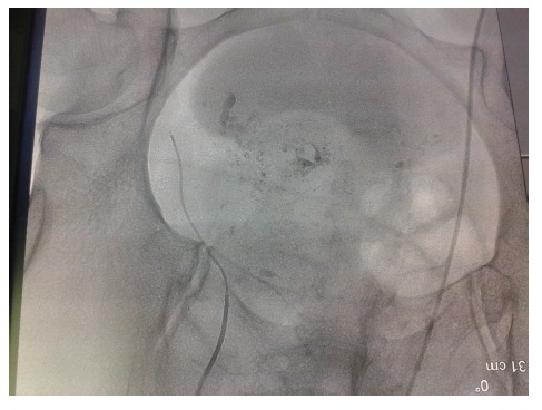 Figure 3A: Uterine arteries were enlarged by means of hypervascular infusion of methotrexate before uterine artery embolization.