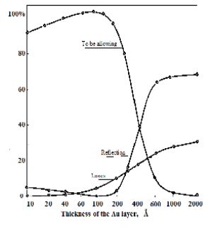 Figure 1: The dependence of reflection, absorption and conductivity of the metal (Au) thickness in the structure.