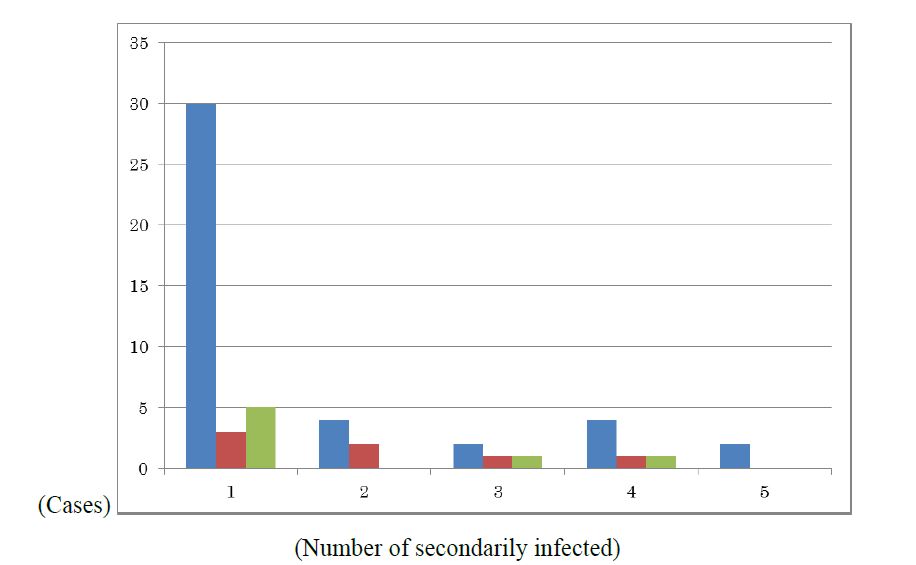 We used a procedure to estimate the case distributions among numbers of infected cases developed in our earlier study [7]. Although infected cases or unlinked cases for which the infection source was unknown represented most cases, the procedure we used ignores information from those cases because it was less credible. However, information about patients who were reported as having infected someone was more reliable than others because, at least, they had been investigated by public health authorities.