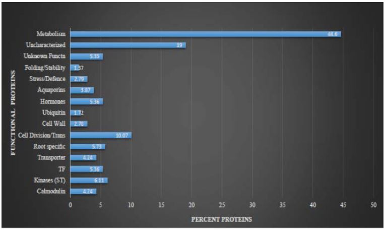 Figure 4:Functional classification of expressed proteins under combined stresses in plasma membranes of maize roots. The numbers and percentages of proteins from each functional category assigned on the basis of identified proteins. Proteins were categorized using the criteria of Bevan et al. (1998).